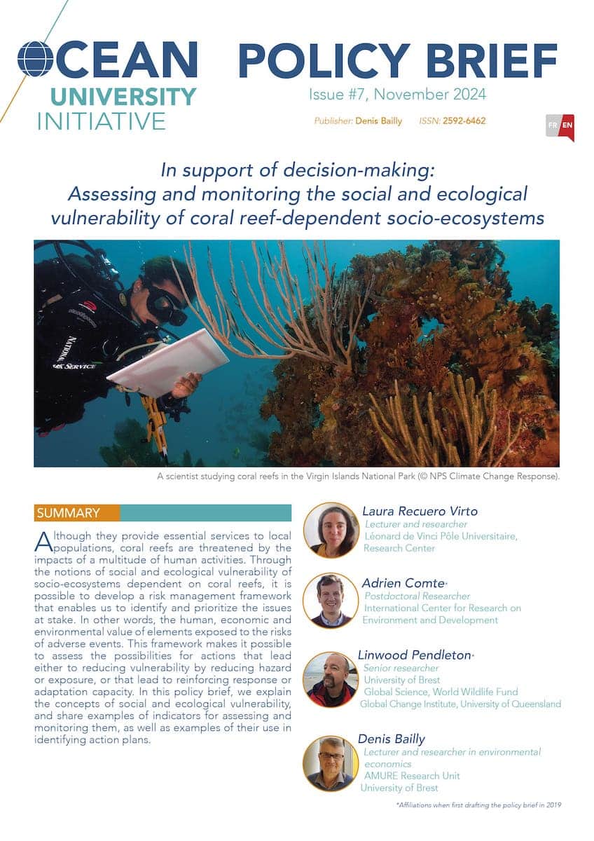 Recuero Virto L., Comte A., Pendleton L., Bailly D., 2024. In support of decision-making: assessing and monitoring the social and ecological vulnerability of coral reef-dependent socio-ecosystems. Ocean University Initiative, Policy Brief, Issue 7, Univ Brest, France.